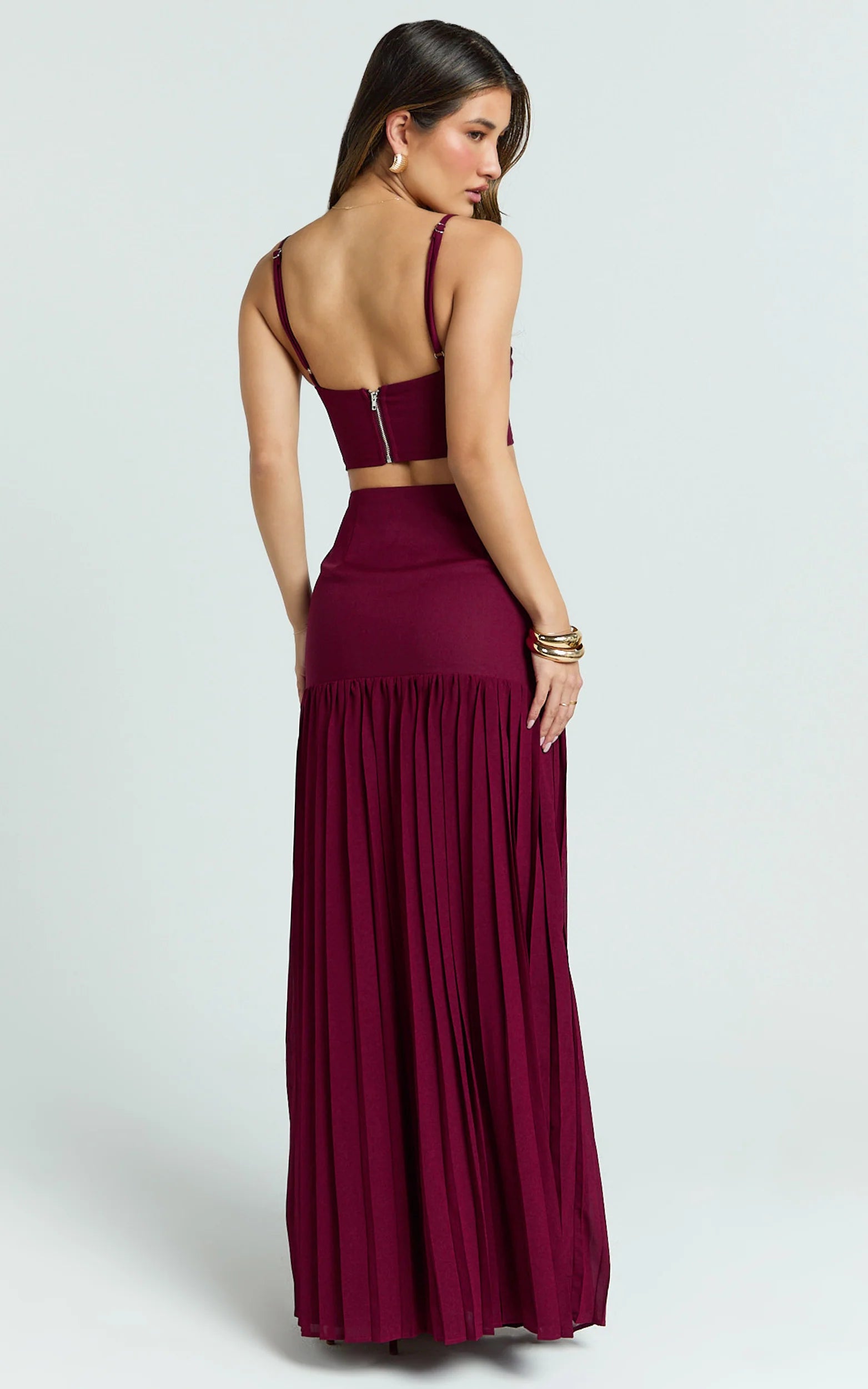 This two piece set brings together a square neck crop top and high waist pleated skirt for the ultimate co-ord skirts moment, perfect for turning every outing into an occasion. Flirty pleats add movement while the rich, deep shade elevates any day-to-night look.