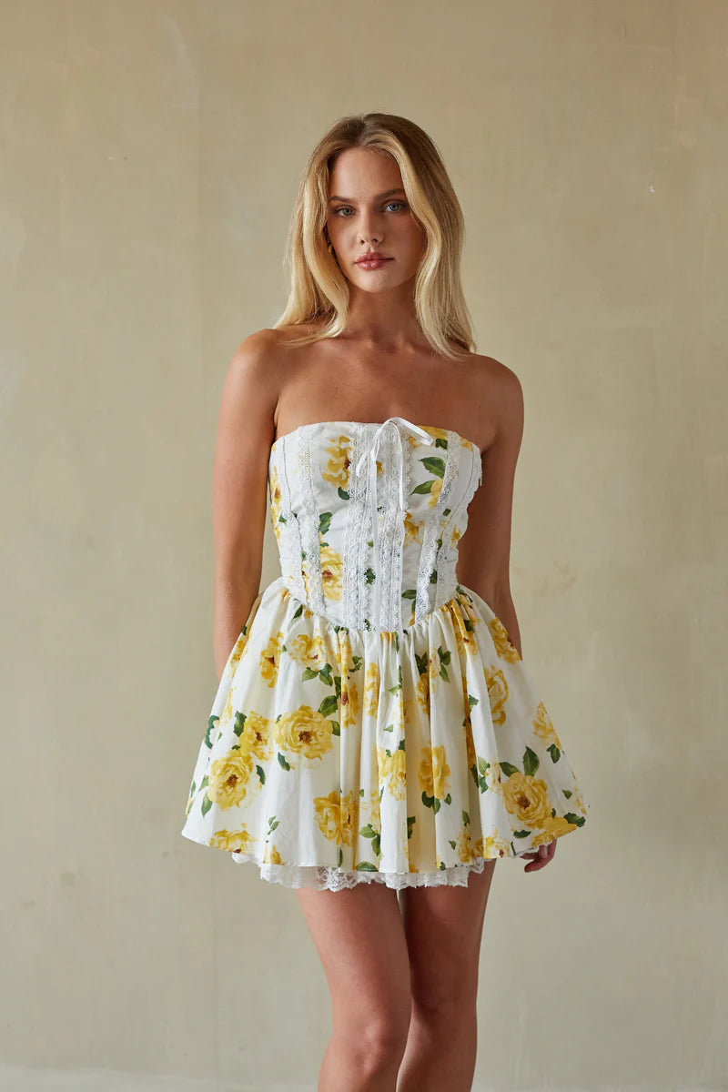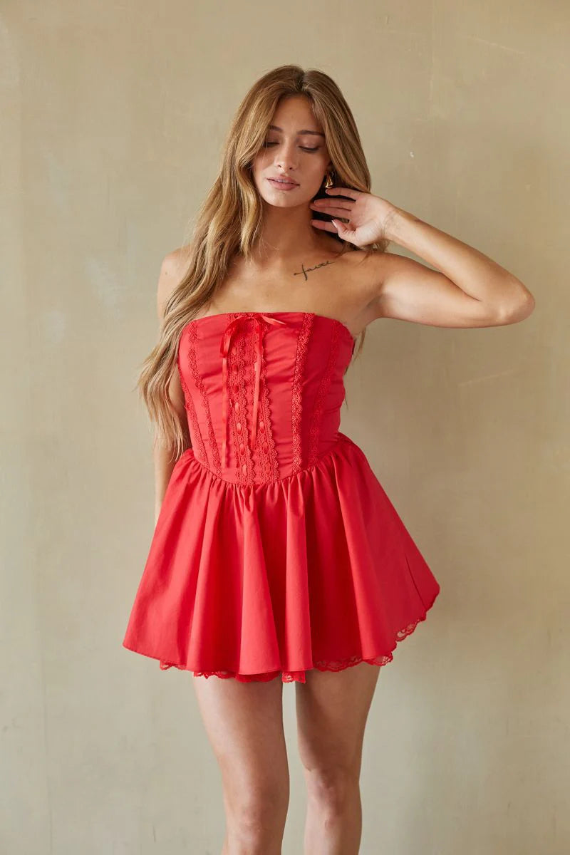 Calling all angels, the Sabrina Strapless Coquette Corset Mini Dress is the perfect Grad Dress for hopeless romantics. This white mini dress features a flattering fit + flare silhouette, lace detailing, and lace up back closure! Available in Pure White; style with a pair of chic heels to complete the look!