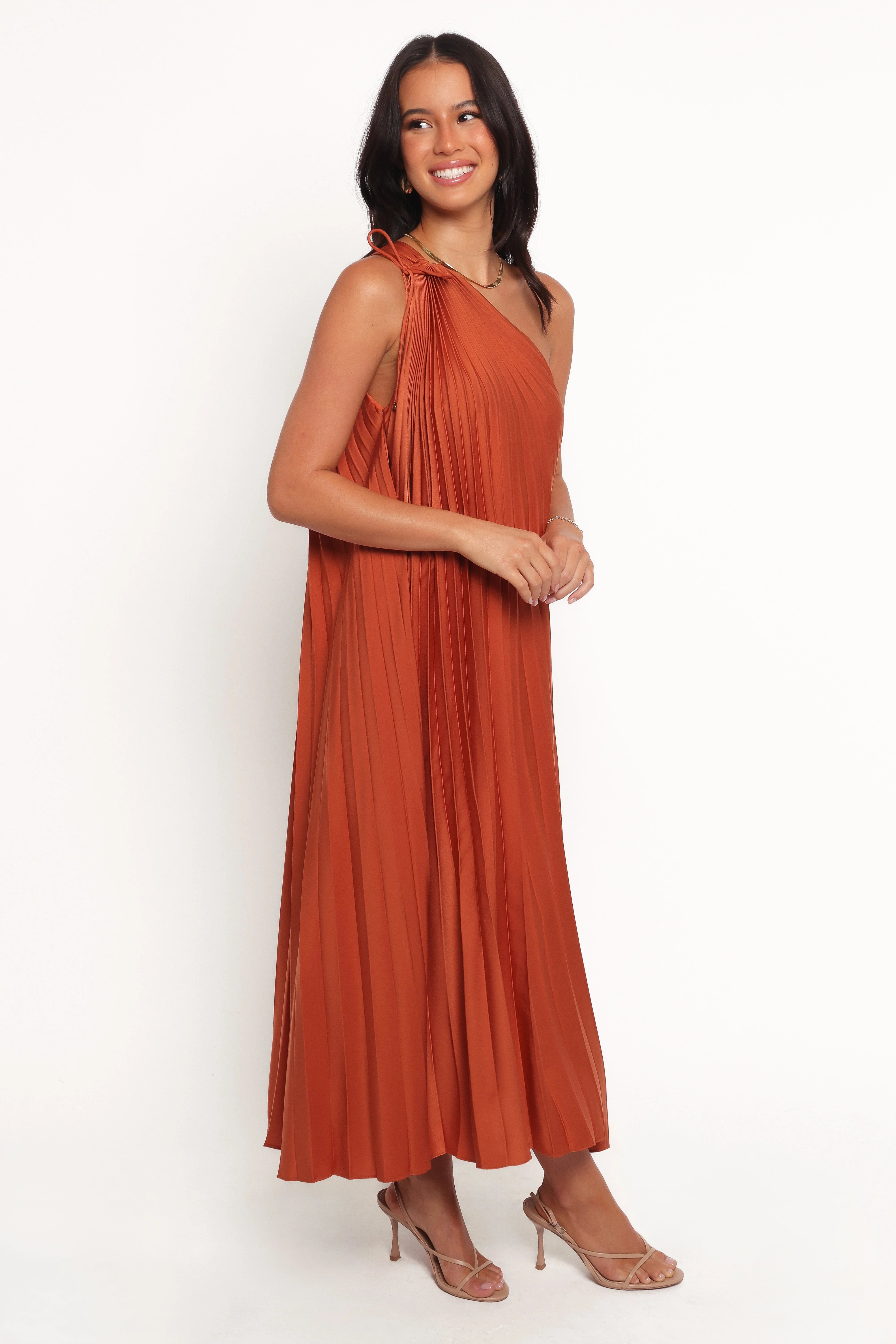 DETAILS This dress combines elegance and modern flair with its asymmetrical neckline and one-shoulder design, making it a standout piece for any occasion. The tie detail on the strap adds a unique touch, while the pleated material creates a beautiful texture that catches the light with every move.