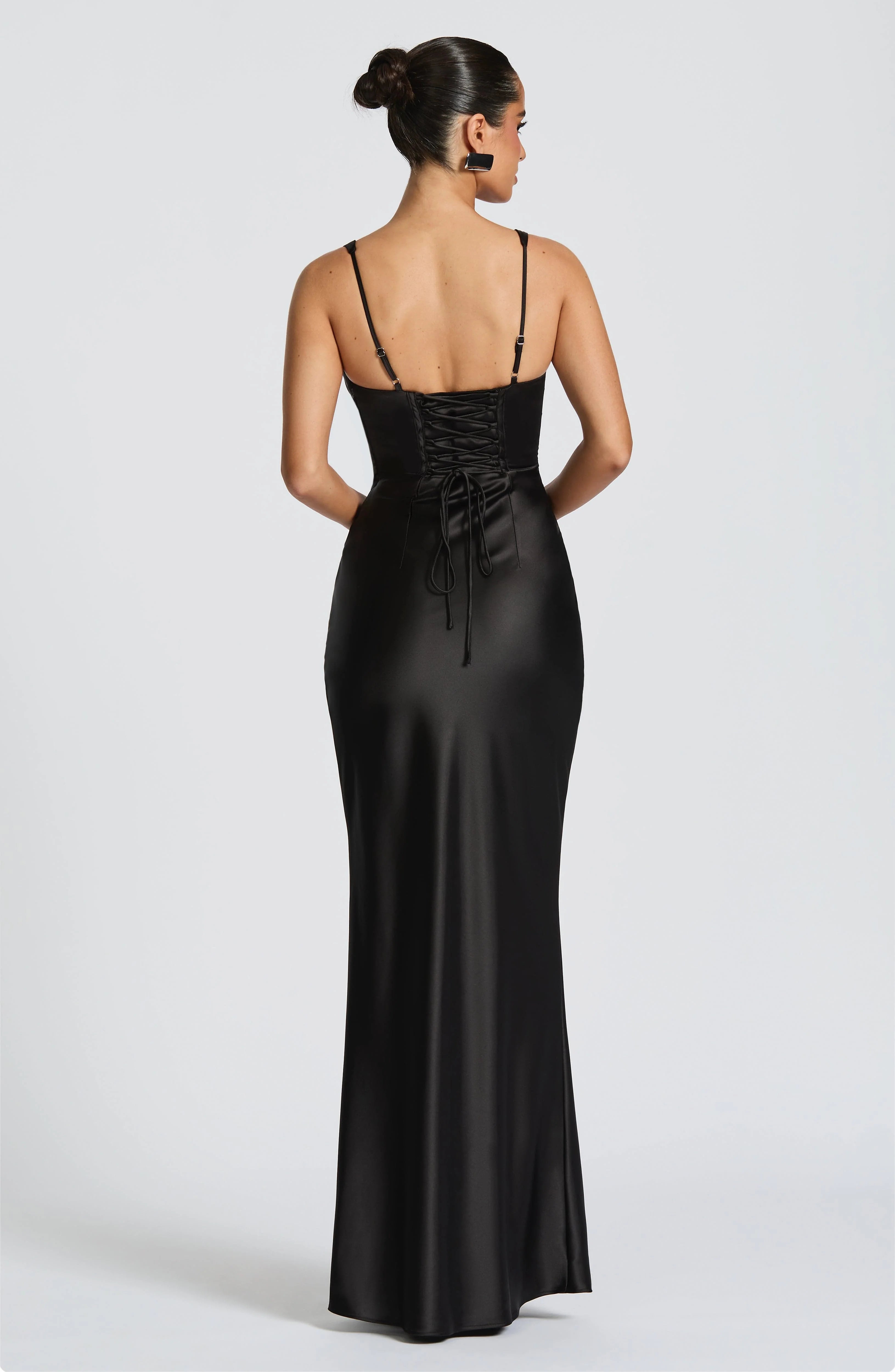 Introducing the Shae Maxi Dress, made from luxurious non-stretch satin that flows elegantly with every step. The plunge neckline and corset overlay with boning create a flattering silhouette, while the lace up back adds a touch of romance. Tapered straps and a bias cut skirt complete this timeless and exclusive piece.