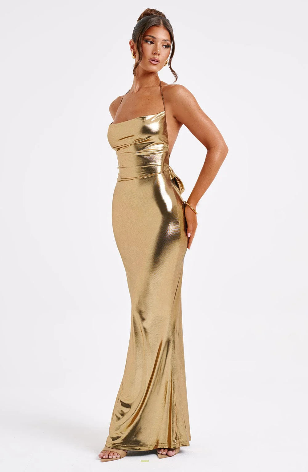 Talisa is the kind of dress you'll want to wear for special date nights, parties and champagne with the girls. Made from our premium metallic jersey, it hugs the body and falls elegantly, with a floor sweeping maxi length. A show stopping low back is framed by tie straps, while the front is finished with a cowl neck to compliment the bust perfectly.