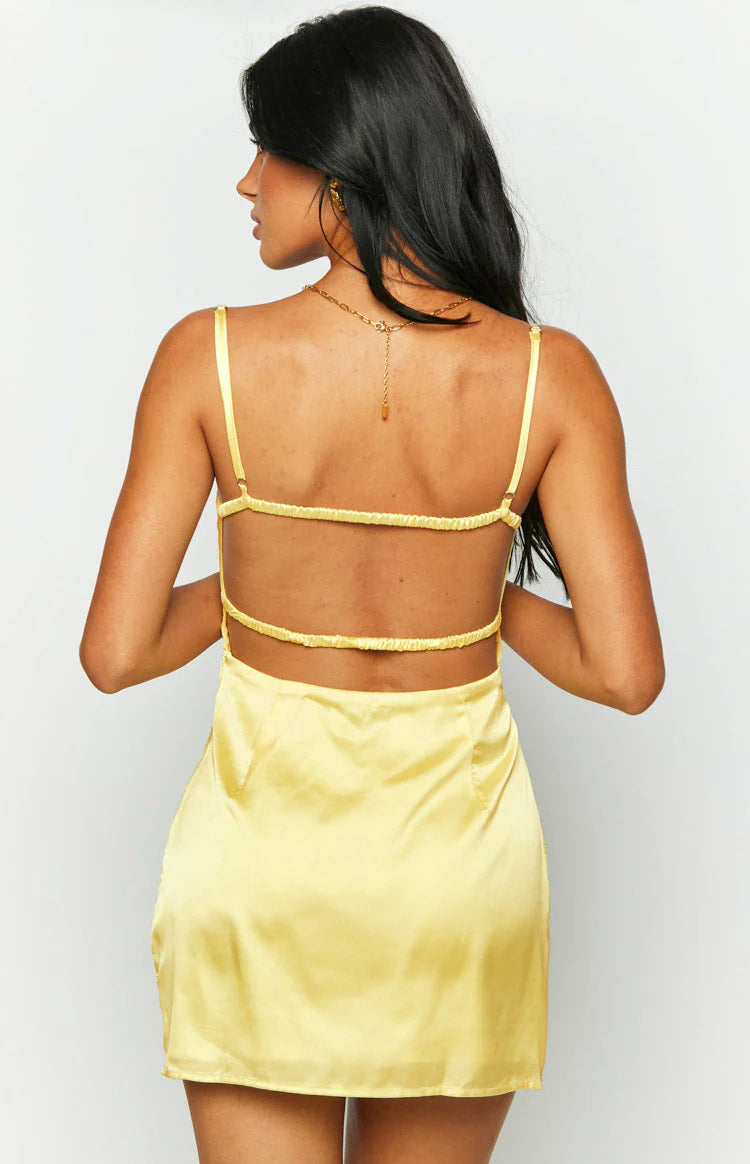 This yellow mini dress is perfect for any event, whether it's day drinking with the girls or date night. Style with some cute sandals and sunglasses for a more casual look, or dress it up with clear strappy heels.