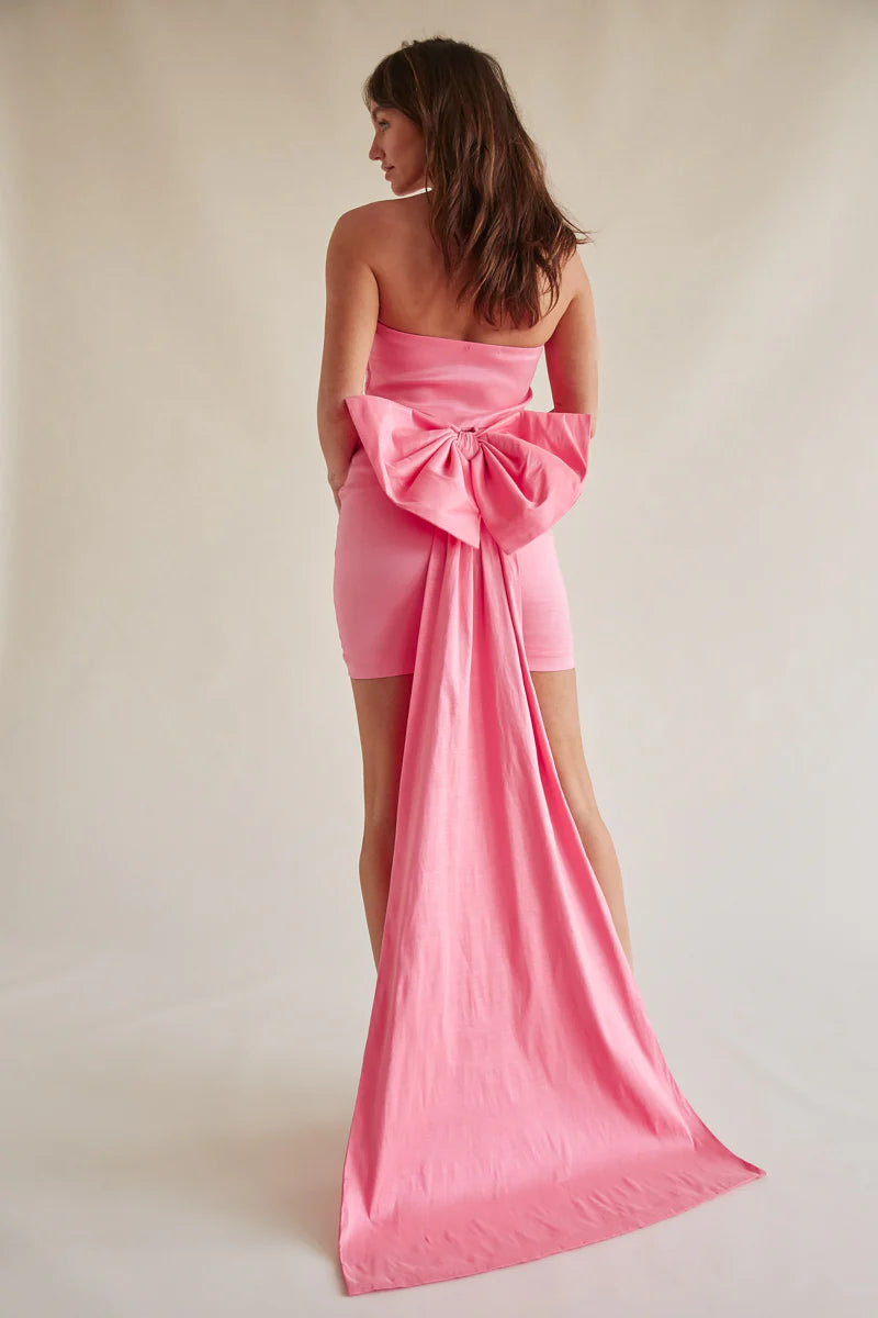 So elegant in the Valencia Strapless Bodycon Bow Train Mini Dress. This perfectly coquette mini dress features a straight across strapless neckline, a statement bow on the back, and a floor-length train. Available in pink, white and black.