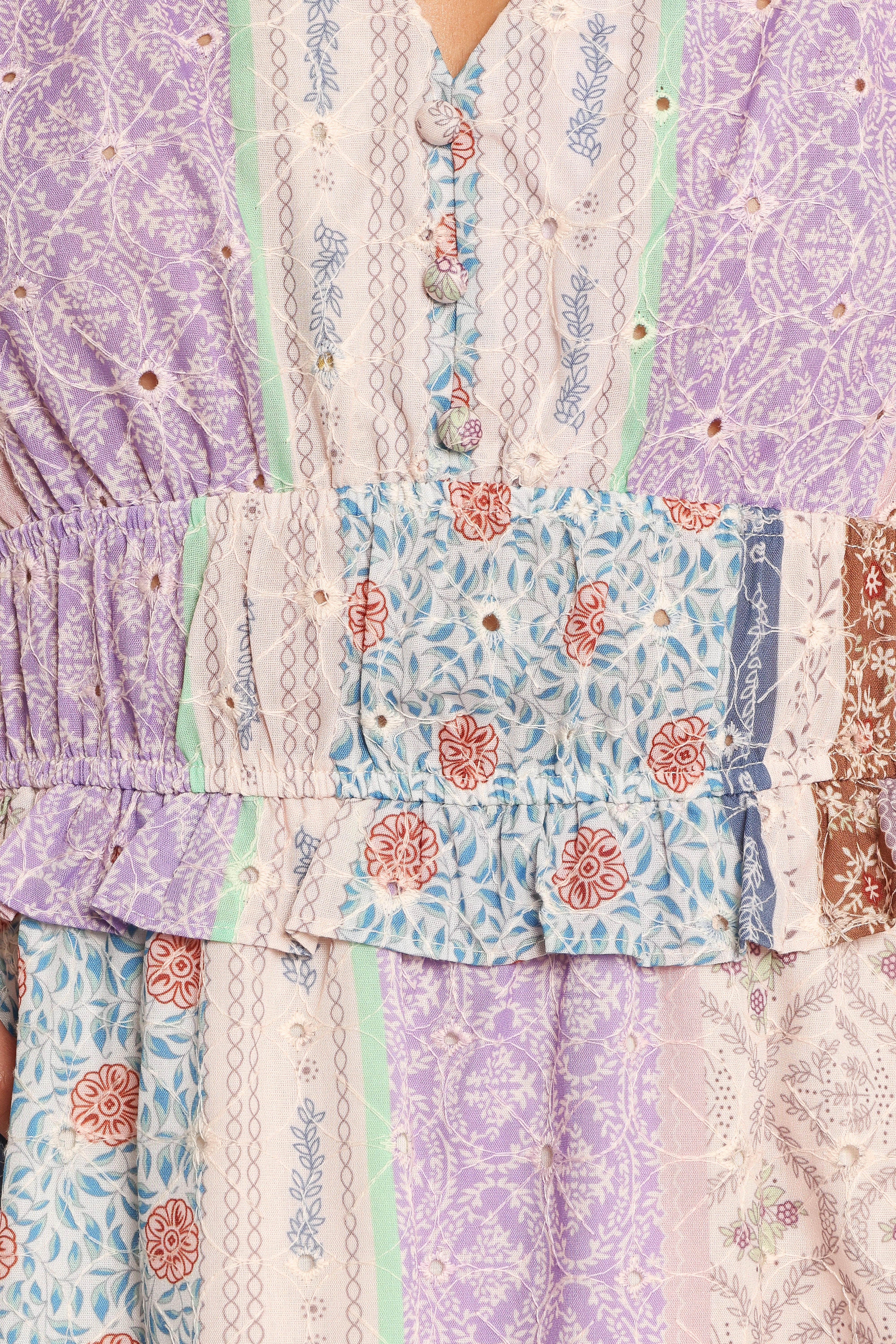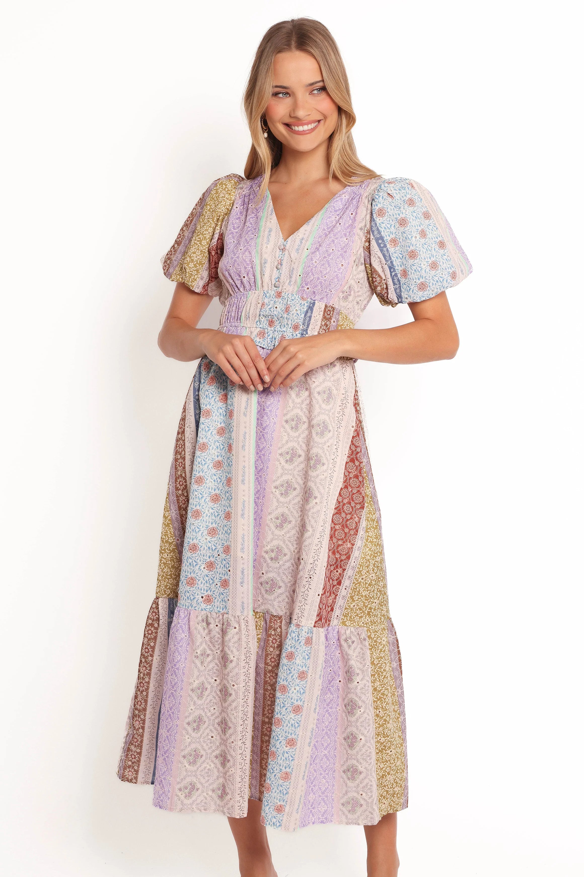DETAILS This exquisite dress combines vintage charm with modern flair, making it a must-have for any fashion-forward wardrobe. The midi length gracefully flows with every step, while the V neckline adds a touch of sophistication. Designed with short puff sleeves and elasticised cuffs, this dress offers both style and comfort.