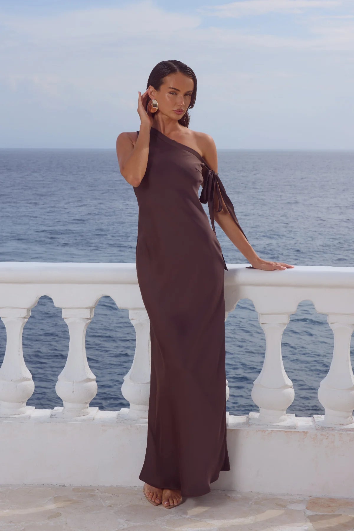Our Viola Maxi Dress is a unique piece with an asymmetrical neckline that ties at the arm, perfect for a classic look with a twist.