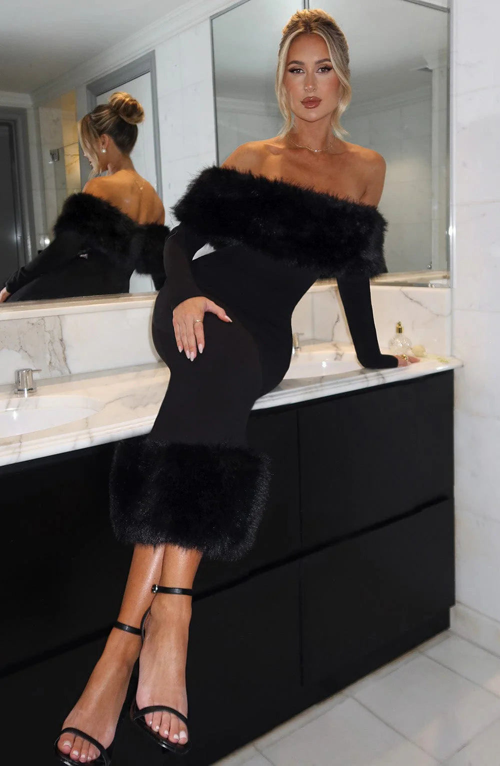 A cosy must-have - meet Vittoria, our fur trimmed, bardot midi dress. Made with plush faux fur trimmed neckline and hemline, the design has long sleeves, pencil shaped skirt and hugs every inch of your curves.
