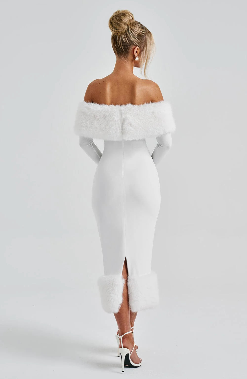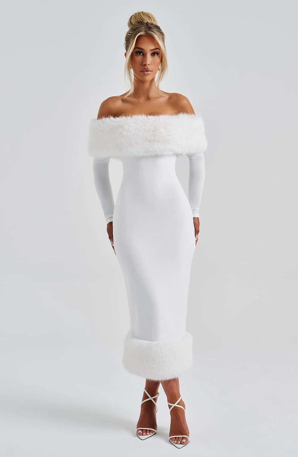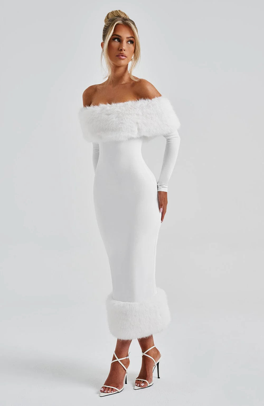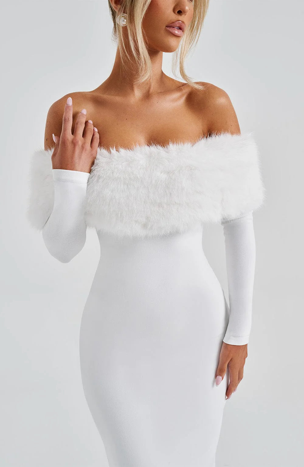 Get ready to turn heads in the Vittoria Midi Dress! Made with premium stretch crepe fabric, this body-hugging dress features a playful Bardot neckline and luxurious faux fur trim. With long sleeves and a pencil skirt, it's perfect for any occasion. Available in elegant ivory, this midi dress is sure to make a statement.