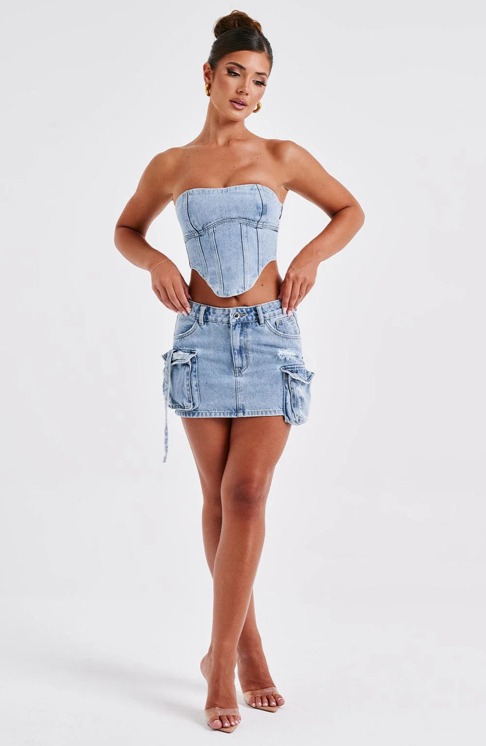 Do double denim to perfection with the Yasie corset and Flor maxi skirt. Our new denim corset is super sleek, made with strapless styling and a cinched fit.