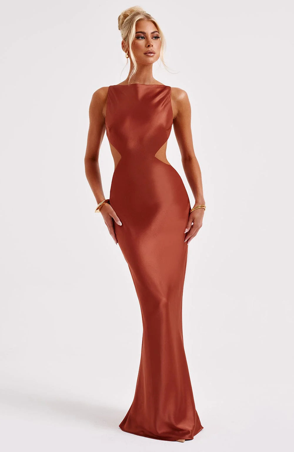Keep them staring in the Yves maxi, crafted in premium bias cut satin that drapes beautifully over the figure for your silhouette of dreams. With a modern high neck and flattering back cut out, pair her with platforms and a soft hair up.
